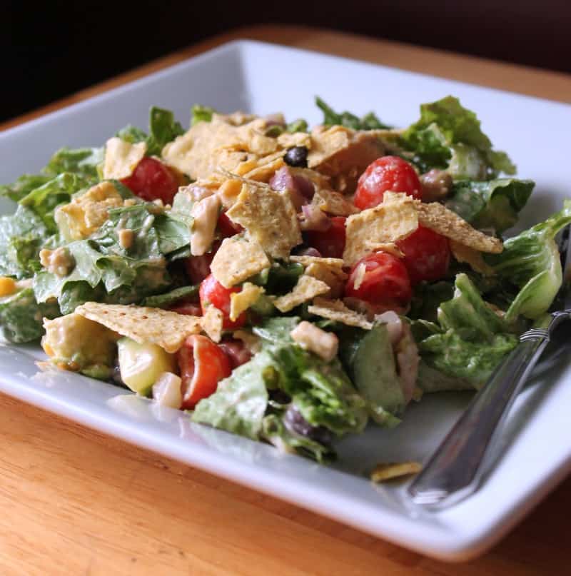Last but not least I crushed about 4 tortilla chips and added that to the salad after I mixed and poured it onto the plate. I would not place the chips in with the salad. I think they would lose their crunch that way. Just throw them into a Ziploc snack bag and bring it with you.