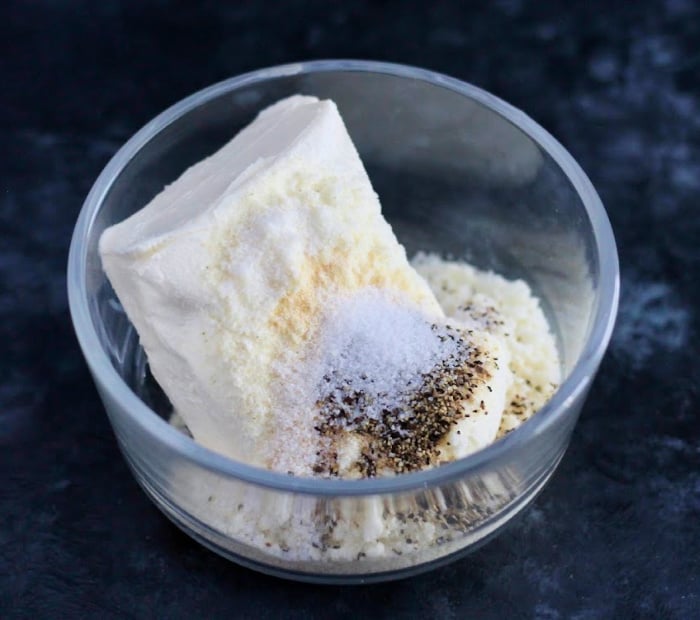 - In a small mix together cream cheese, romano cheese, salt, pepper, onion powder, and garlic powder. Set aside.