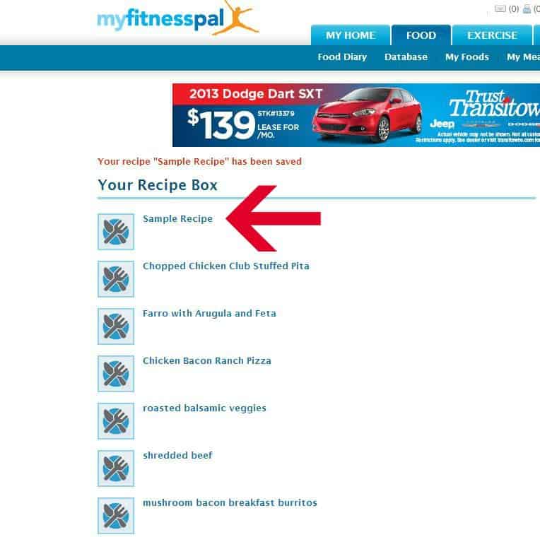 After you click on the food tab you will be brought to your daily food diary page. You want to click on the tab in the second top navigation bar that says recipes.