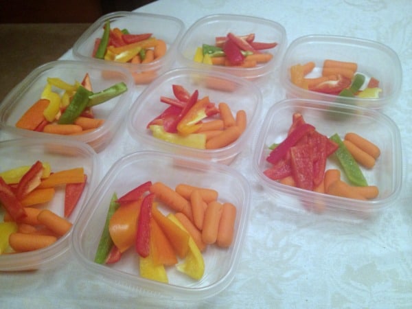 - vegetables were cut and put into veggie packs. These stay crisp all week for me. I add hummus the morning I take them. I purchase wegmans brand but you can make your own hummus if you wish.