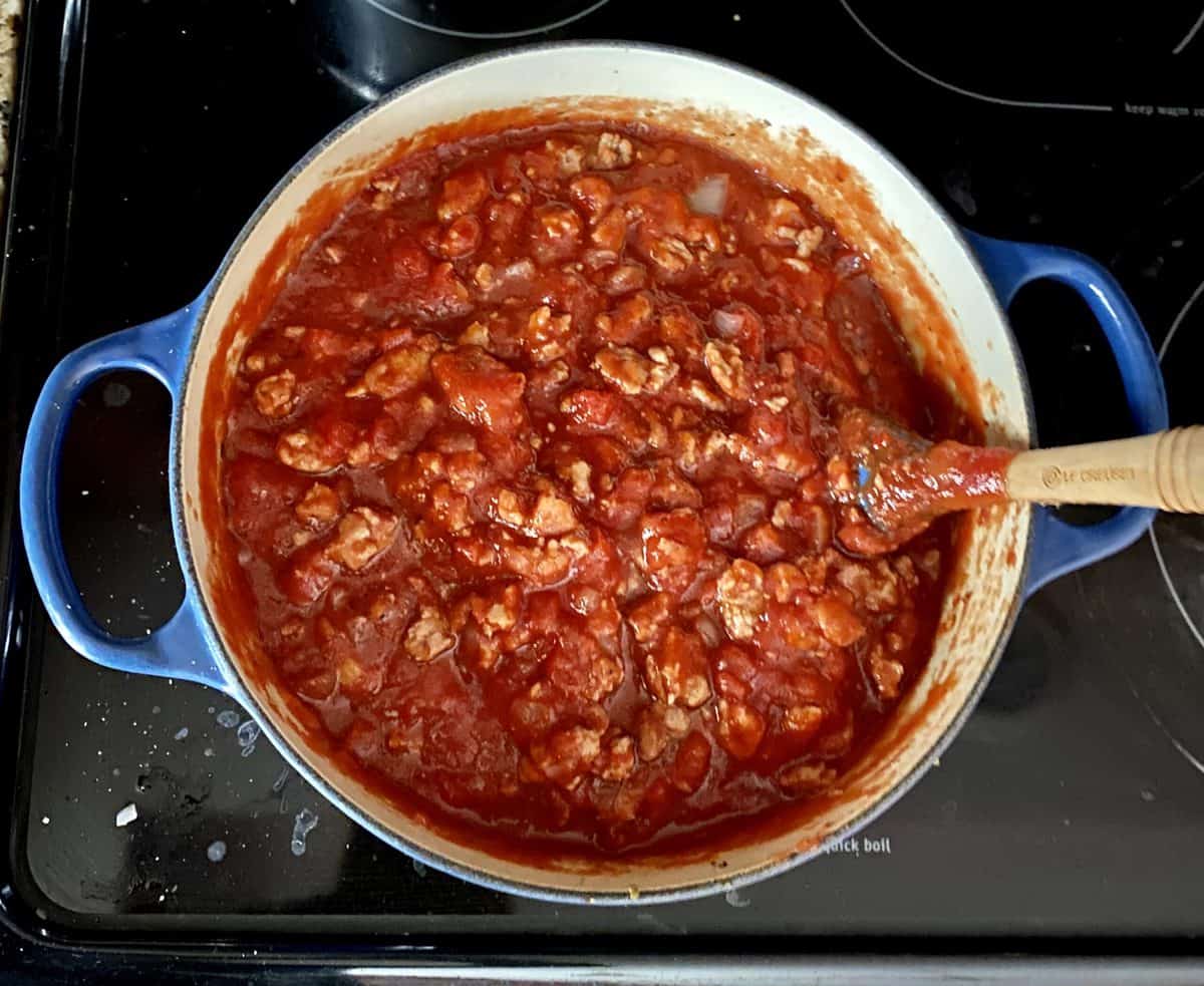 I let this sauce cook for about 3 hours and stirred it occasionally. You’ll know it’s ready when you see a thick, rich, deep red sauce and all of the meat is very tender. Most likely, it’ll be done at 2 hours but if you can go another hour then that’s even better.
